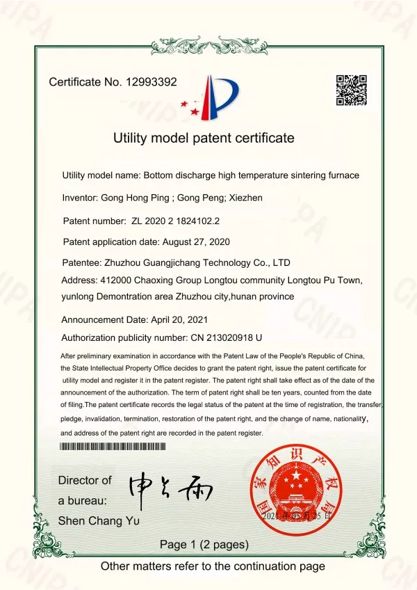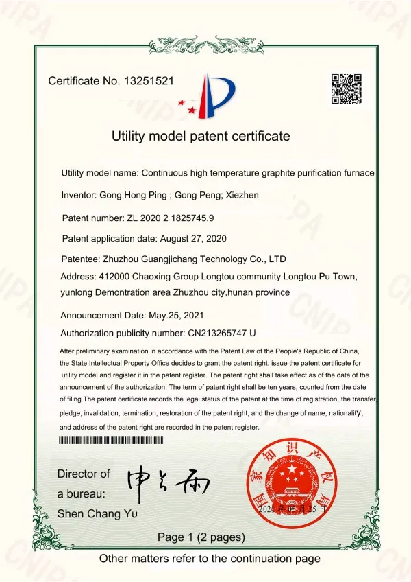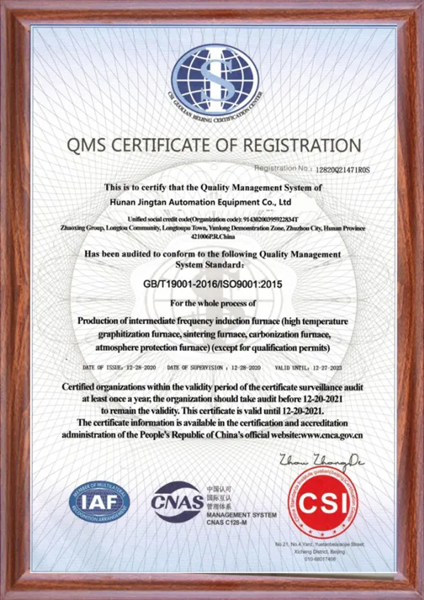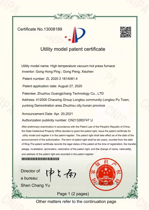 В настоящее время компания обладает многочисленными патентами на полезные модели, сертификатами ISO 9001:2015 (Система менеджмента качества), CE и другими. Для постоянного удовлетворения потребностей заказчиков мы предоставляем высокоэффективные специализированные услуги, основанные на принципах «целевое применение, приоритетная разработка, изготовление на заказ». Максимальная температура наших сверхвысокотемпературных графитировочных печей достигает 3200°C, а усилие вакуумных горячих прессов для спекания достигает 800 тонн.